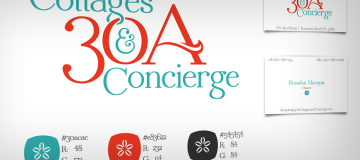 30A Cottages and Concierge is a new property management company in Florida that focuses on very personal, high-end service for both home-owners and renters. The logo needed to feel "clean" and "professional" but it also needed to remind people of the beach and being on vacation. While trying to make it "clean" and "professional", we needed to avoid being "sterile" or "corporate" and one thing that really helped us achieve this goal were the colors. The teal and coral combination is very fun and stands out in the crowd of blue and green logos that their competitors have. One of my favorite 'easter eggs' of this design is the hex-code of the teal color: #30aCaC